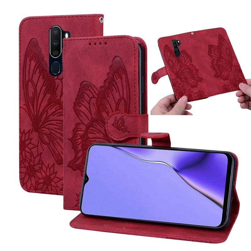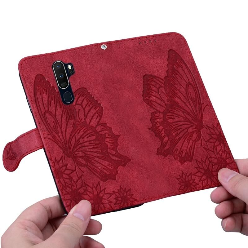 Θήκη δέρματος οριζόντιας αναδίπλωσης για OPPO A9 (2020) με υφή retro, ανάγλυφο σχέδιο πεταλούδων, βάση στήριξης & θήκες για κάρτες & πορτοφόλι (Καφέ)