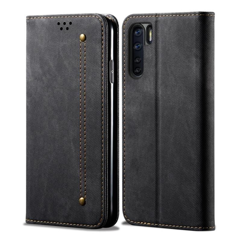 Για OPPO A91 / F15 / Reno 3 Denim υφή Casual στυλ οριζόντια Flip δερμάτινη θήκη με κάτοχο & υποδοχές για κάρτες & πορτοφόλι (Μαύρο)