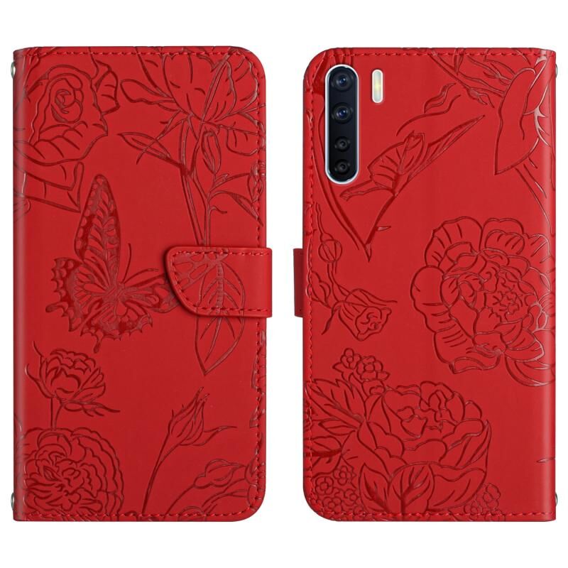 Θήκη τηλεφώνου από δέρμα με ανάγλυφο σχέδιο πεταλούδας και παιώνιας για OPPO A91 (Κόκκινο)