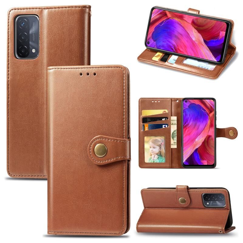 Για OPPO A93 5G / A74 5G Αμιγές χρώμα δερμάτινη θήκη τηλεφώνου πόρπη με κορδόνι & πλαίσιο φωτογραφιών & υποδοχή κάρτας & πορτοφόλι & λειτουργία Stand (Καφέ)