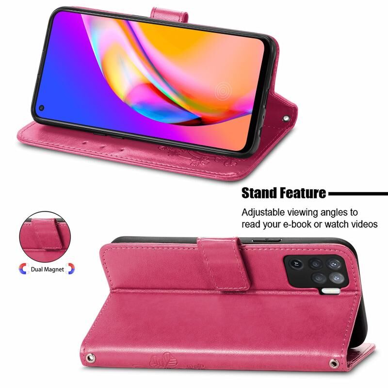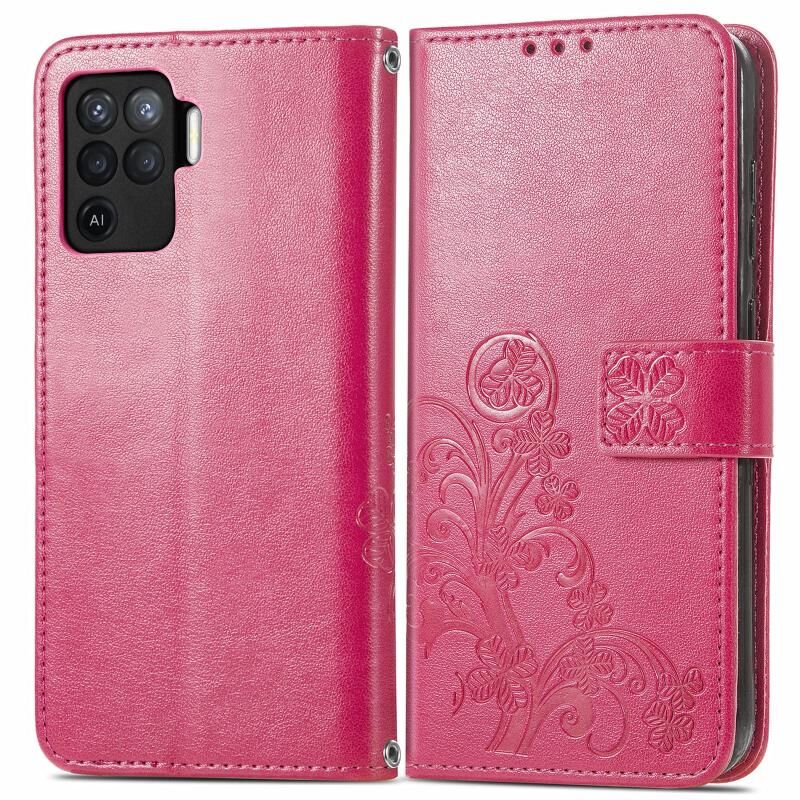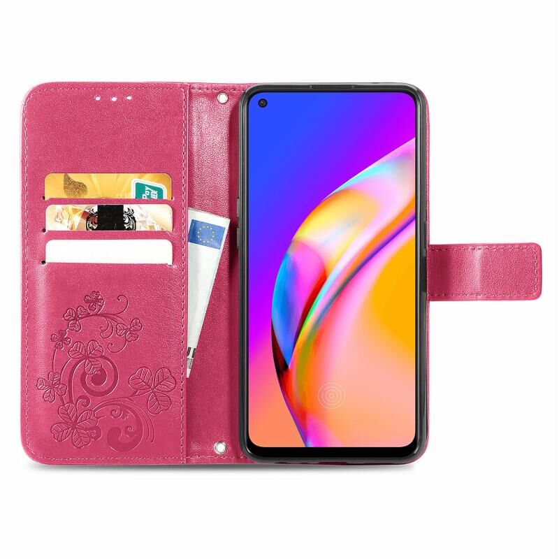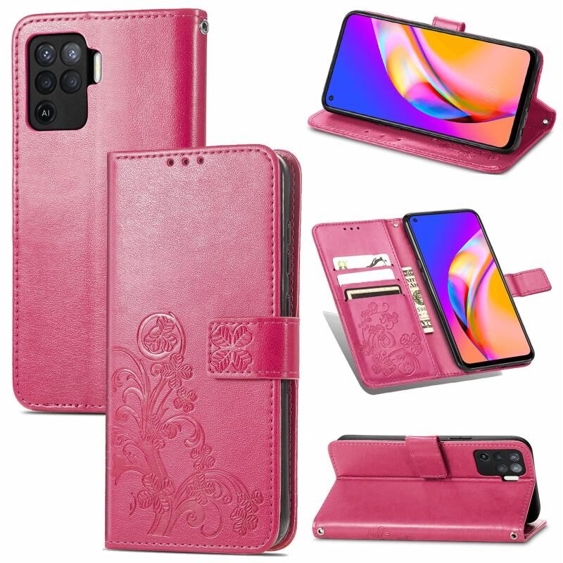 Για OPPO A94 4G/ F19 Pro Four-leaf Clasp ανάγλυφο αγκράφα κινητό τηλέφωνο προστασία δερμάτινη θήκη με κορδόνι & υποδοχή κάρτας & πορτοφόλι & βραχίονα λειτουργία (Rose Red)