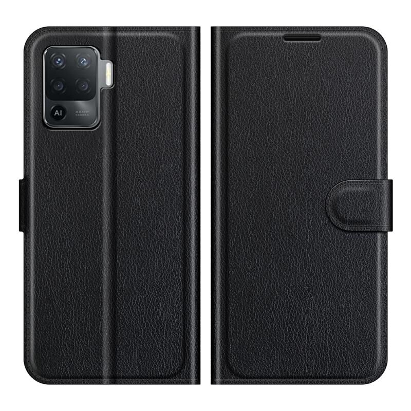 Θήκη προστασίας οριζόντιας αναδίπλωσης με υφή λυτσί για OPPO A94 4G / F19 Pro / Reno 5 Lite με βάση στήριξης & υποδοχές καρτών & πορτοφόλι (Μαύρο)