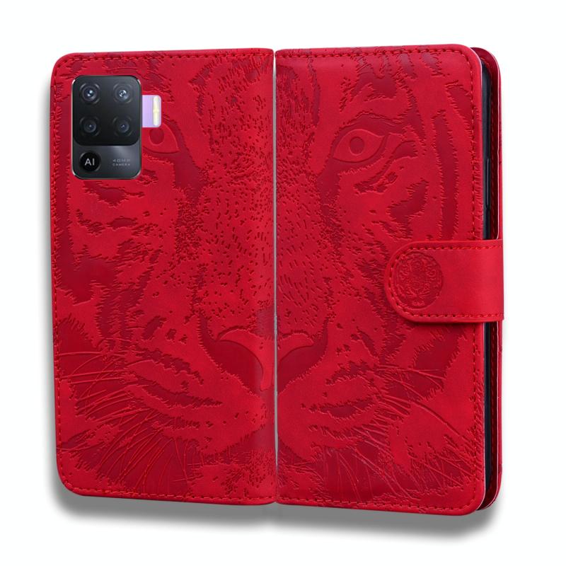 Θήκη δέρματος οριζόντιας αναδίπλωσης με ανάγλυφο σχέδιο τίγρης για OPPO A94 4G / F19 Pro με βάση στήριξης & υποδοχές καρτών & πορτοφόλι (Καφέ)