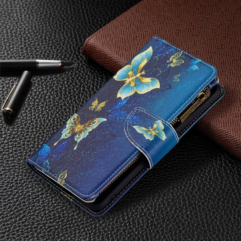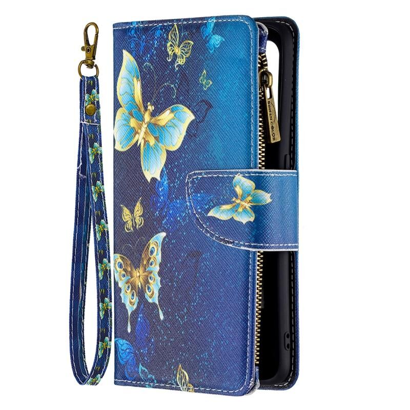 Θήκη δέρματος οριζόντιας αναδίπλωσης με φερμουάρ και σχέδια ζωγραφικής για OPPO A94 5G/F19 Pro+ 5G/Reno5 Z 5G με βάση & υποδοχές καρτών & πορτοφόλι (Χρυσή Πεταλούδα)