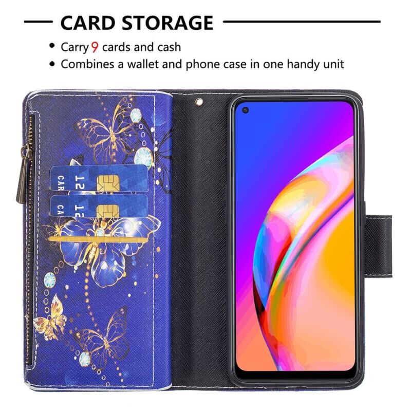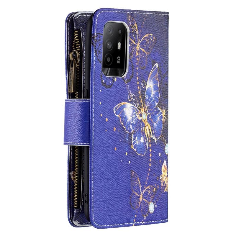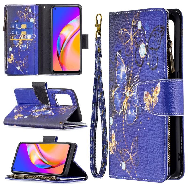 Θήκη δέρματος οριζόντιας αναδίπλωσης με φερμουάρ και σχέδια ζωγραφικής για OPPO A94 5G/F19 Pro+ 5G/Reno5 Z 5G με βάση & υποδοχές καρτών & πορτοφόλι (Πεταλούδα Μωβ)
