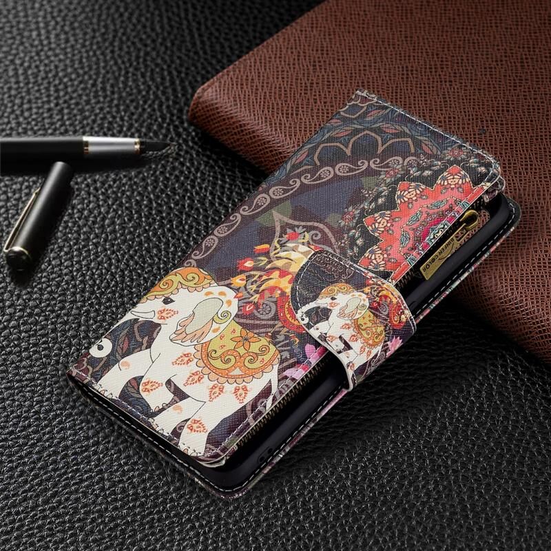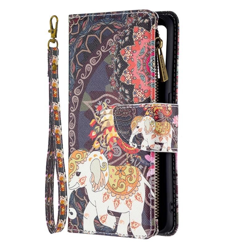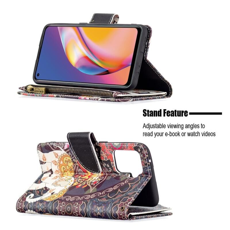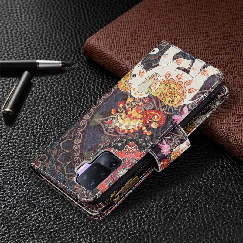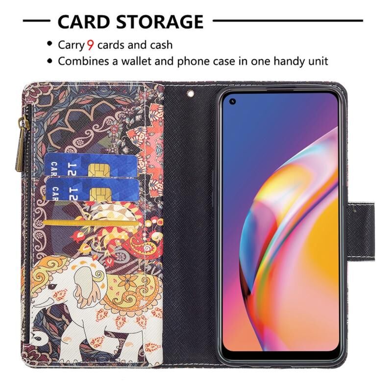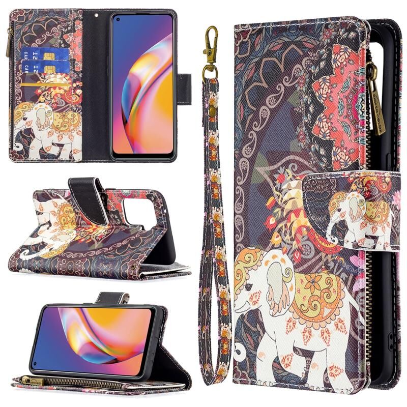 Θήκη δέρματος οριζόντιας αναδίπλωσης με φερμουάρ και σχέδια πολύχρωμης ζωγραφικής για OPPO A94/Reno5 F/F19 Pro με βάση για κάρτες & θήκη πορτοφολιού (Λουλούδια & Ελέφαντες)