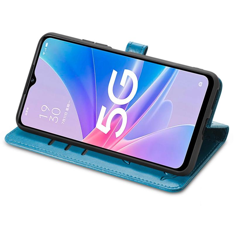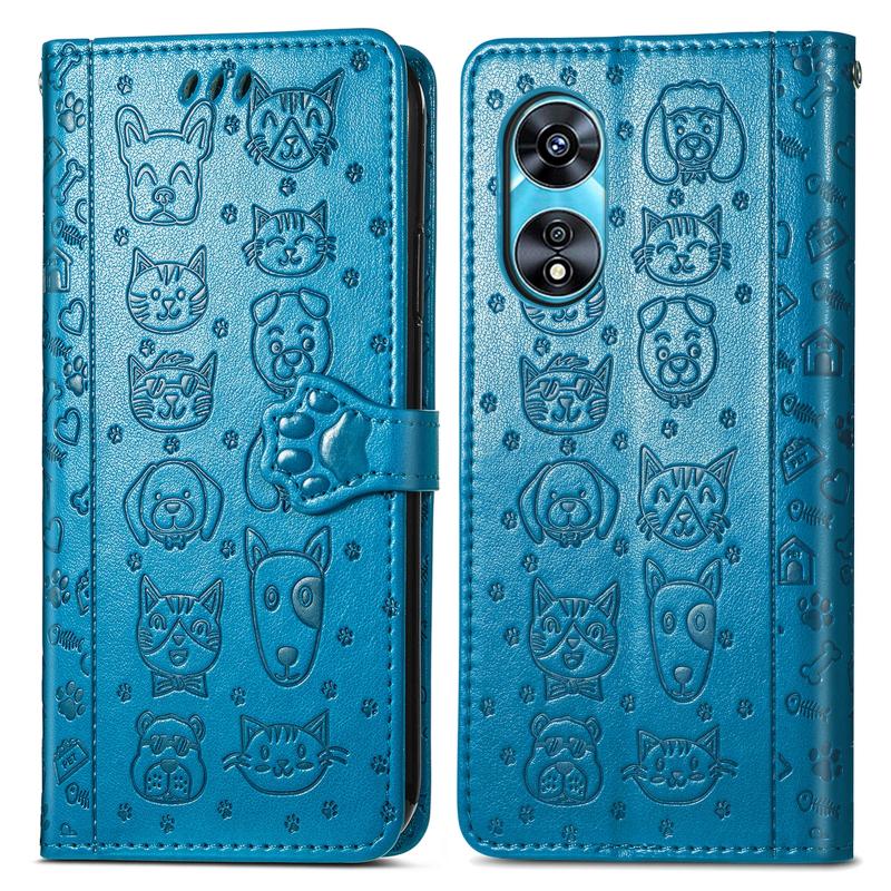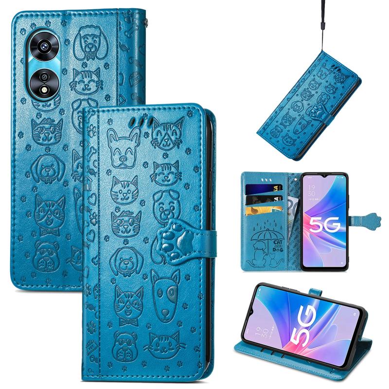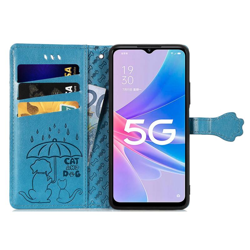 For OPPO A97 5G Cat and Dog Embossed Leather Phone Case(Blue)