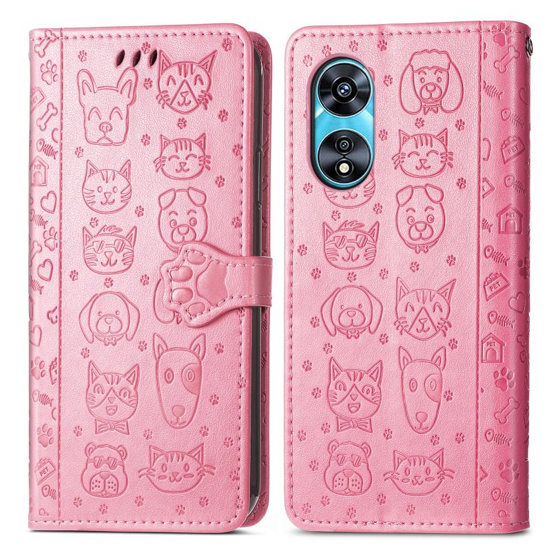 For OPPO A97 5G Cat and Dog Embossed Leather Phone Case(Pink)