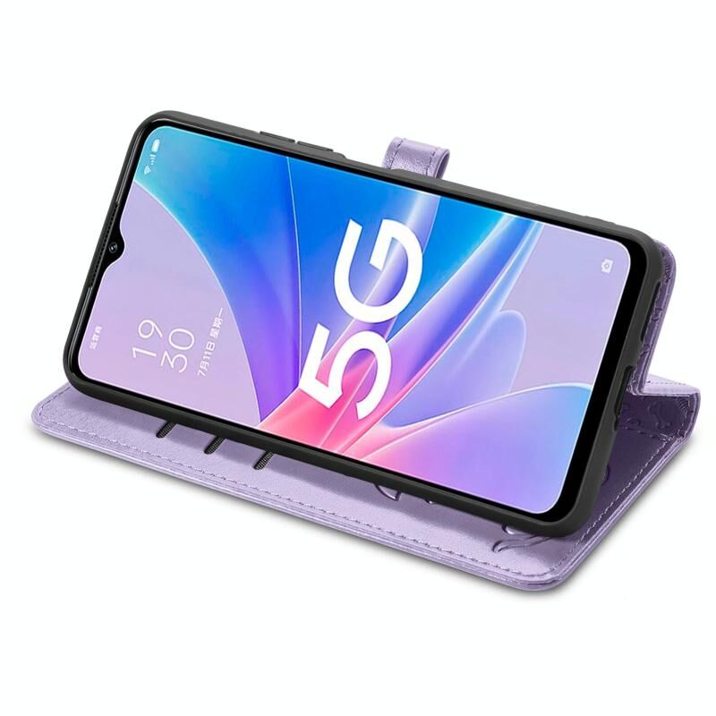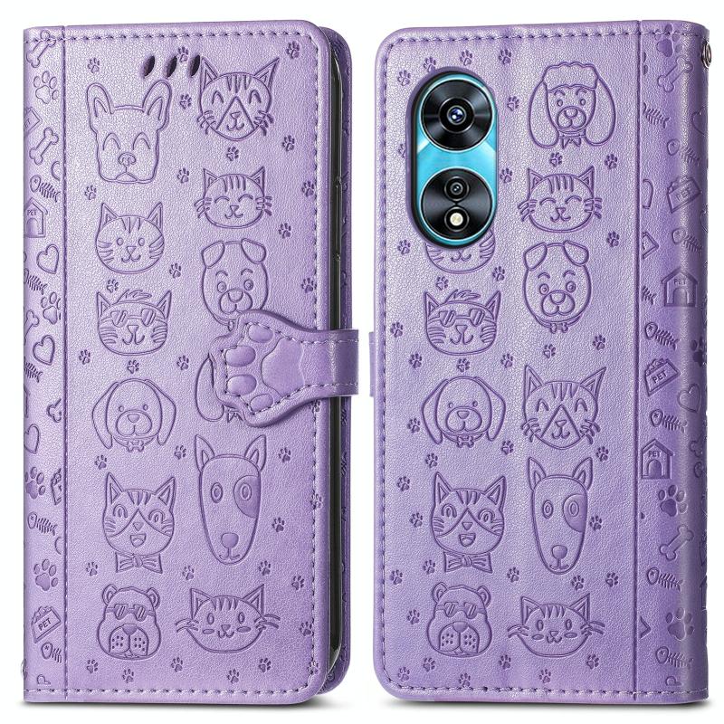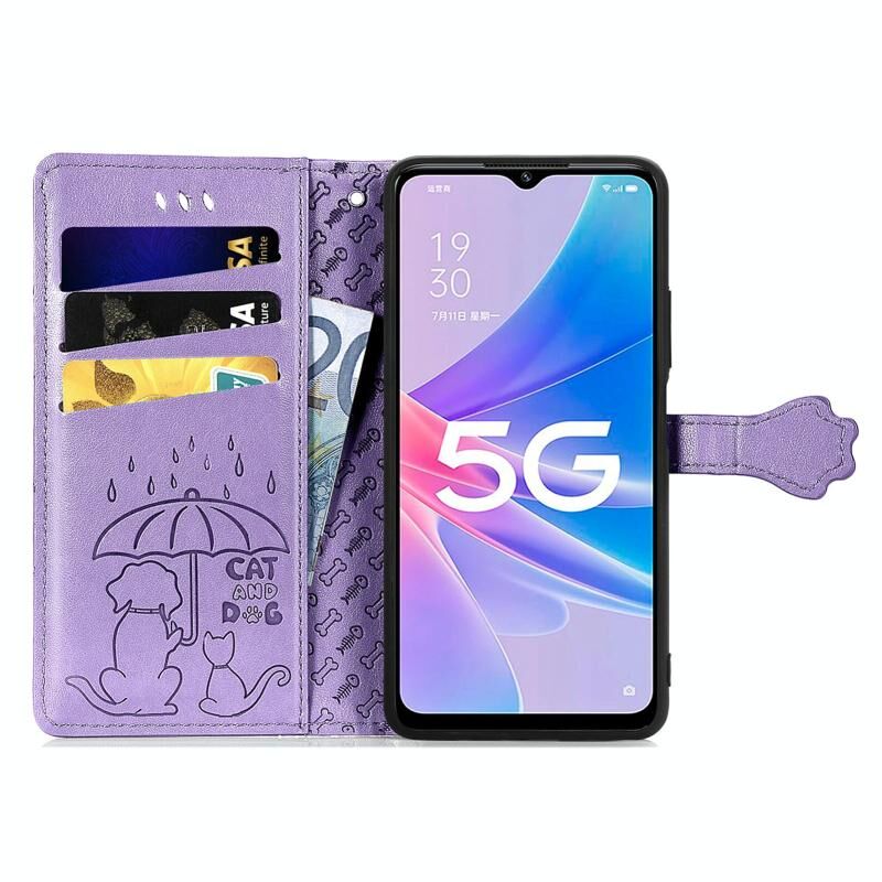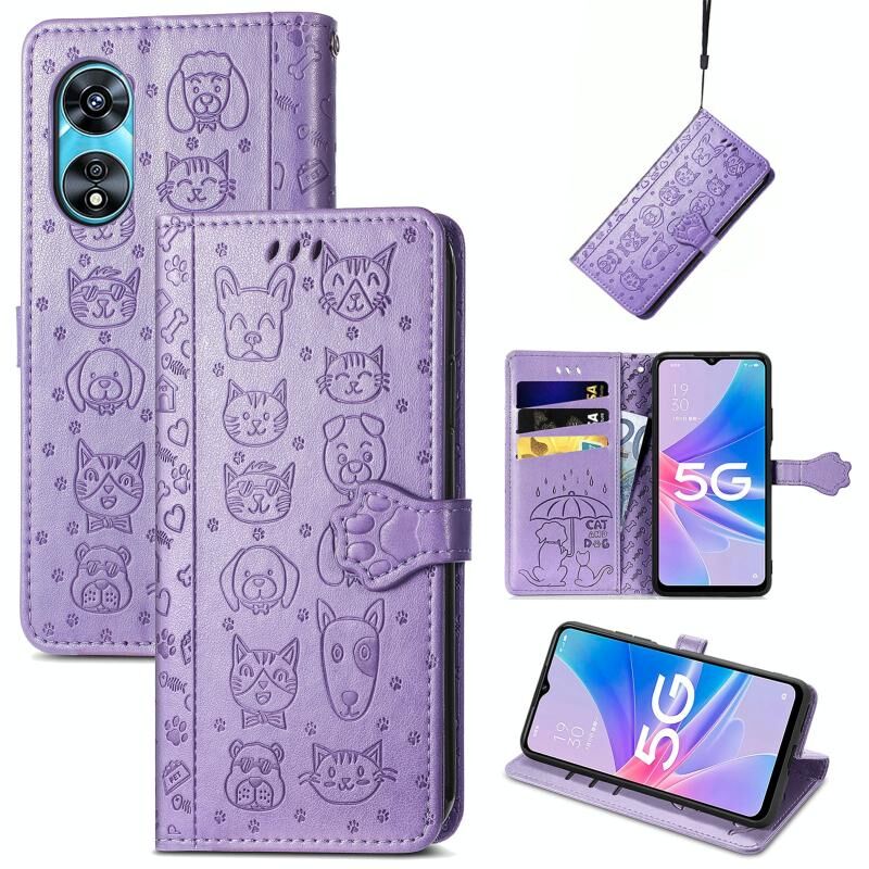 For OPPO A97 5G Cat and Dog Embossed Leather Phone Case(Purple)