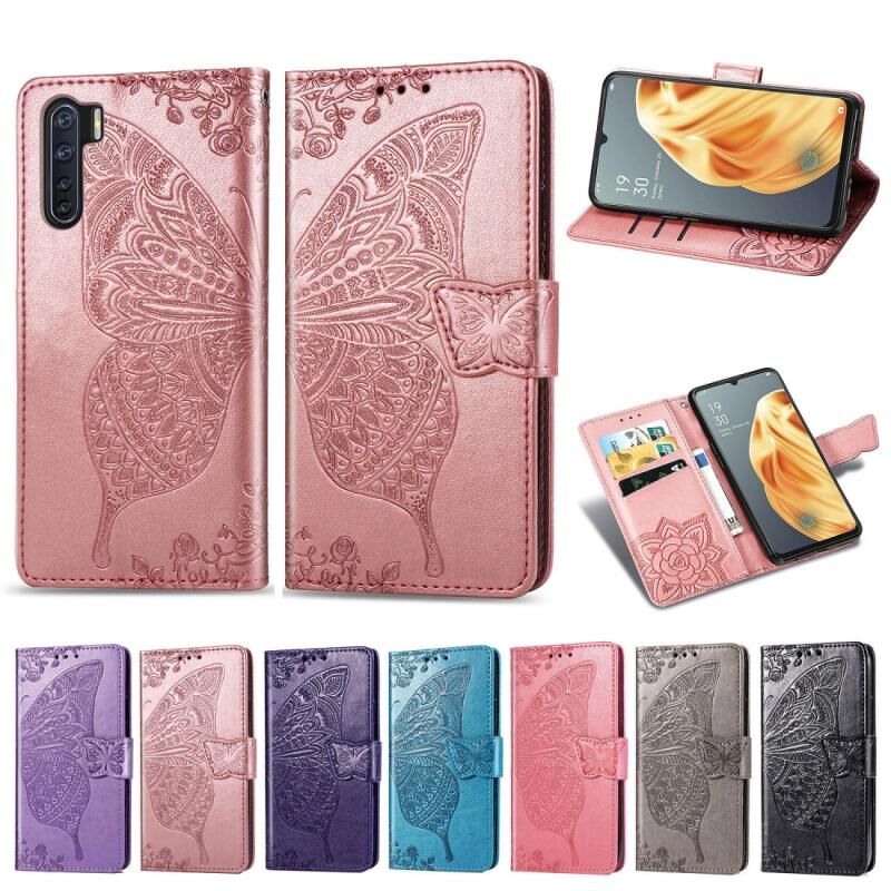 Θήκη δέρματος οριζόντιας αναδίπλωσης για OPPO F15/A91 με ανάγλυφο σχέδιο πεταλούδας και λουλουδιών, με βάση στήριξης / υποδοχή κάρτας / πορτοφόλι / κορδόνι (Μπλε)