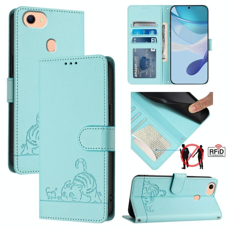 Θήκη τηλεφώνου από δέρμα με ανάγλυφο σχέδιο γάτας και γάτας για OPPO F17 / A73 2020 4G Global με λουρί (Μέντας πράσινο)