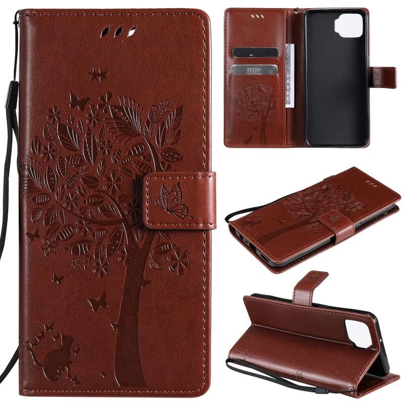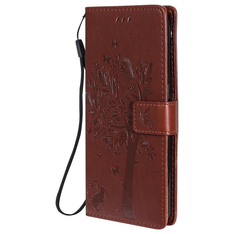 Θήκη για OPPO F17 / A73 με σχέδιο Δέντρου & Γάτας, εκτυπωμένη με θερμοτύπηση, οριζόντια αναδιπλούμενη από δερματίνη PU με βάση στήριξης & θήκες καρτών & πορτοφόλι & κορδόνι (Καφέ)