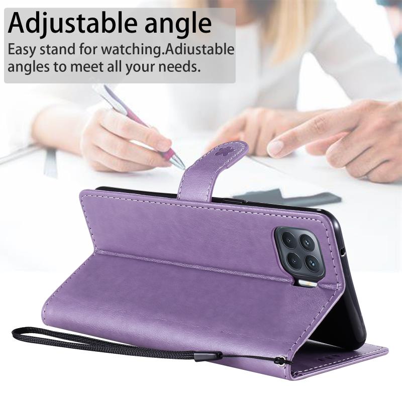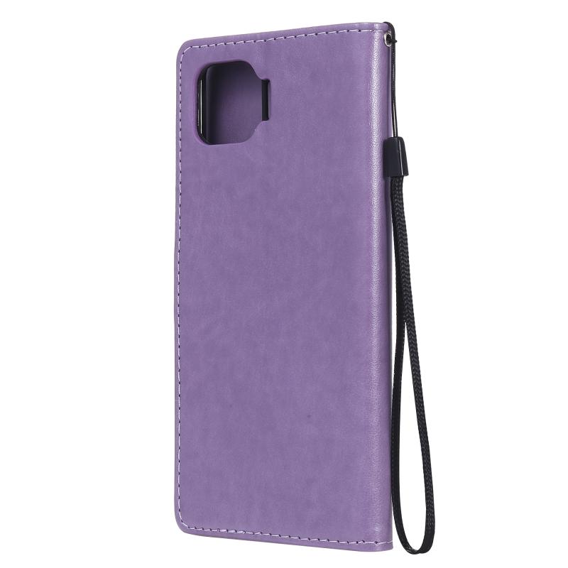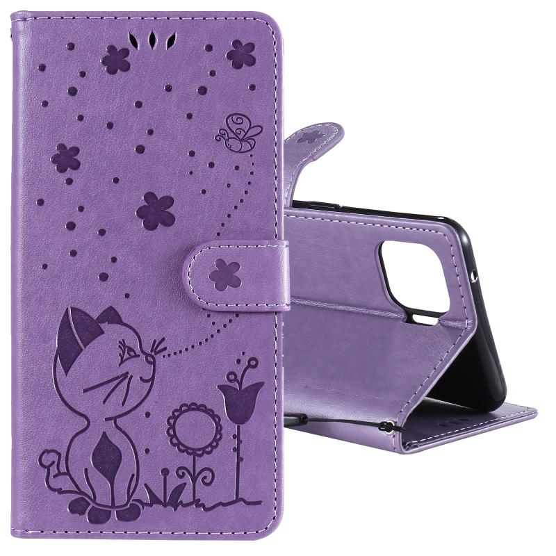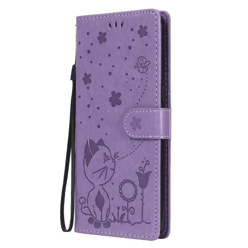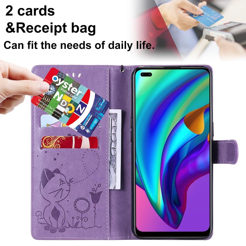 Θήκη δέρματος οριζόντιας αναδίπλωσης με ανάγλυφο σχέδιο Cat Bee, αντικραδασμική για OPPO F17 Pro / Reno4 Lite με βάση στήριξης & υποδοχές καρτών & πορτοφόλι (Μωβ)