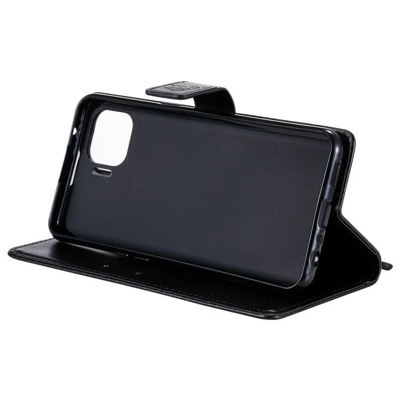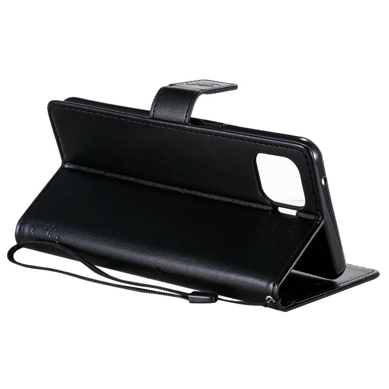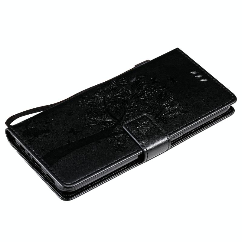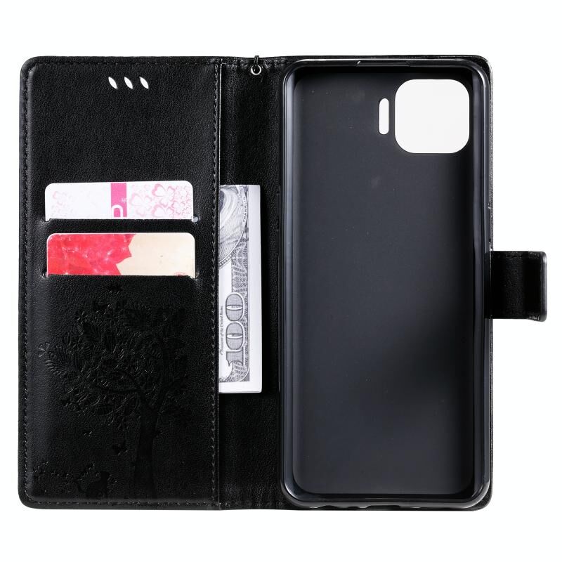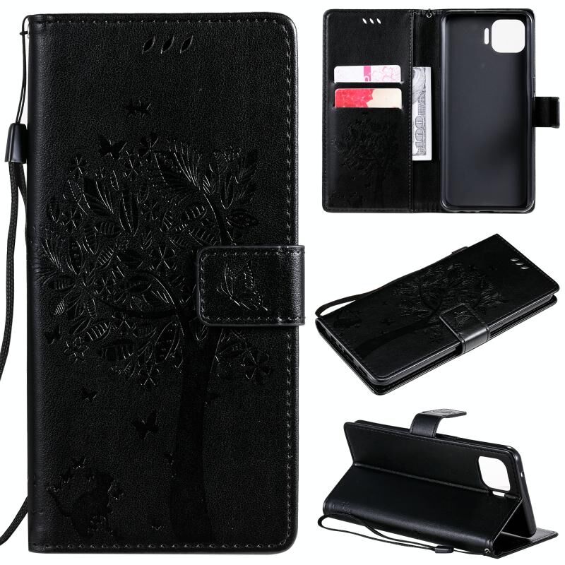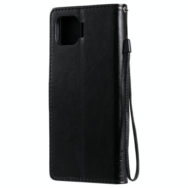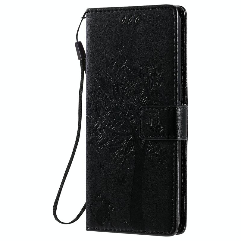 Θήκη για OPPO F17 Pro / Reno4 Lite με σχέδιο Δέντρου & Γάτας, εκτυπωμένη με θερμοτύπωση, οριζόντια αναδιπλούμενη από δερματίνη PU με βάση στήριξης & θήκες καρτών & πορτοφόλι & κορδόνι (Μαύρο)