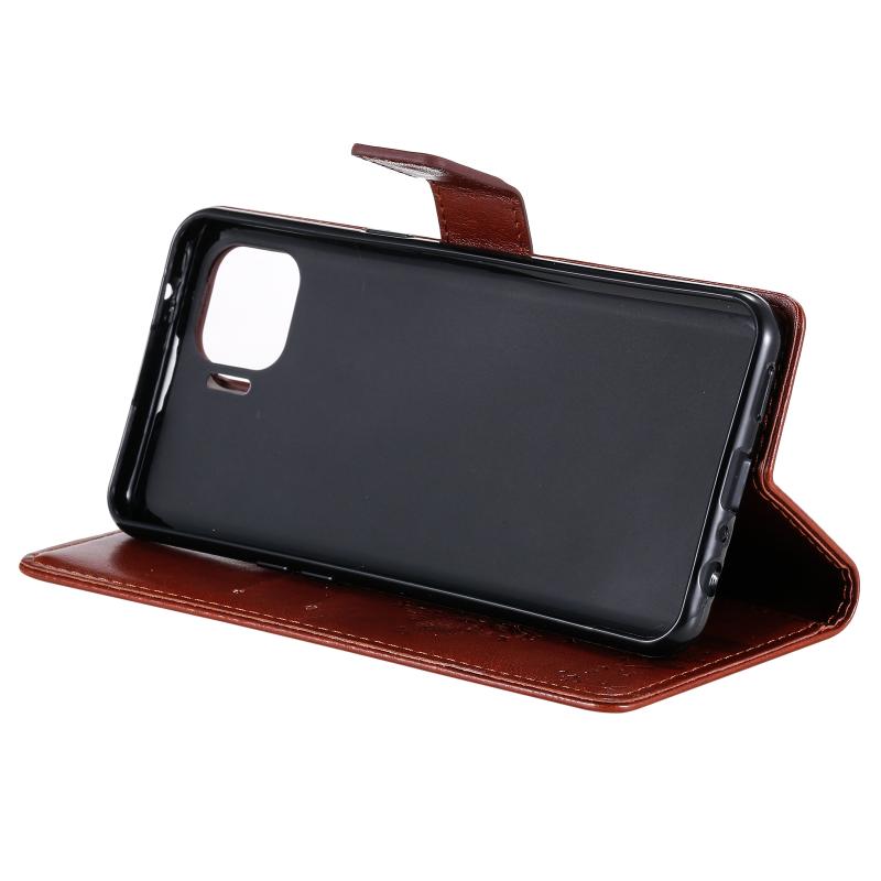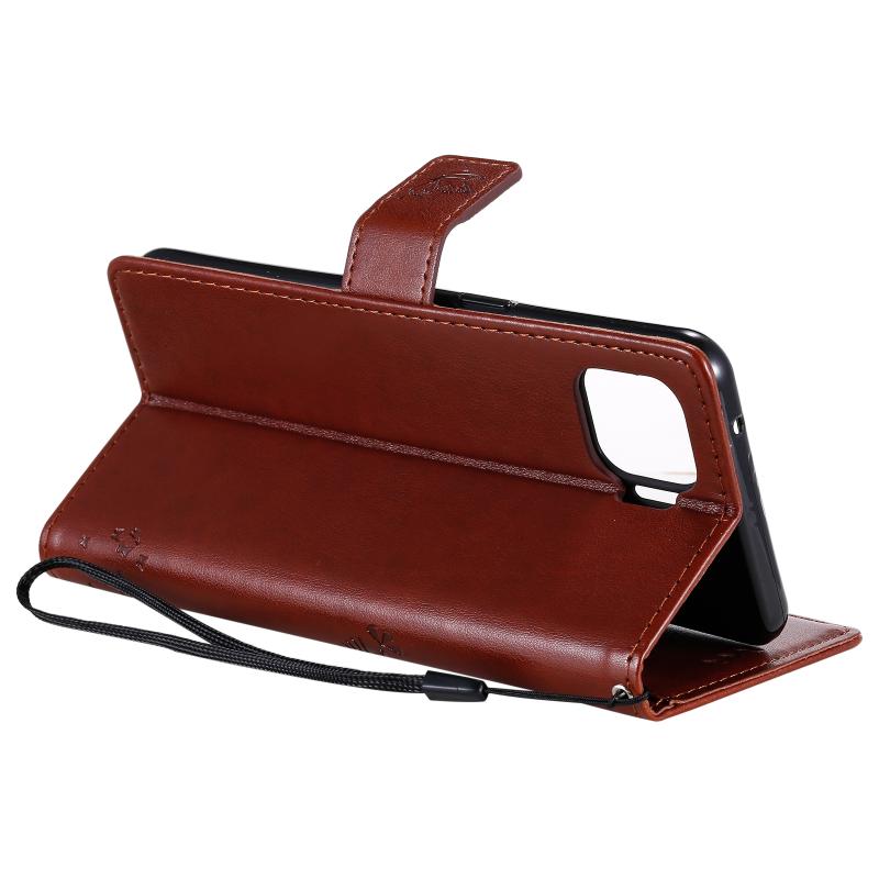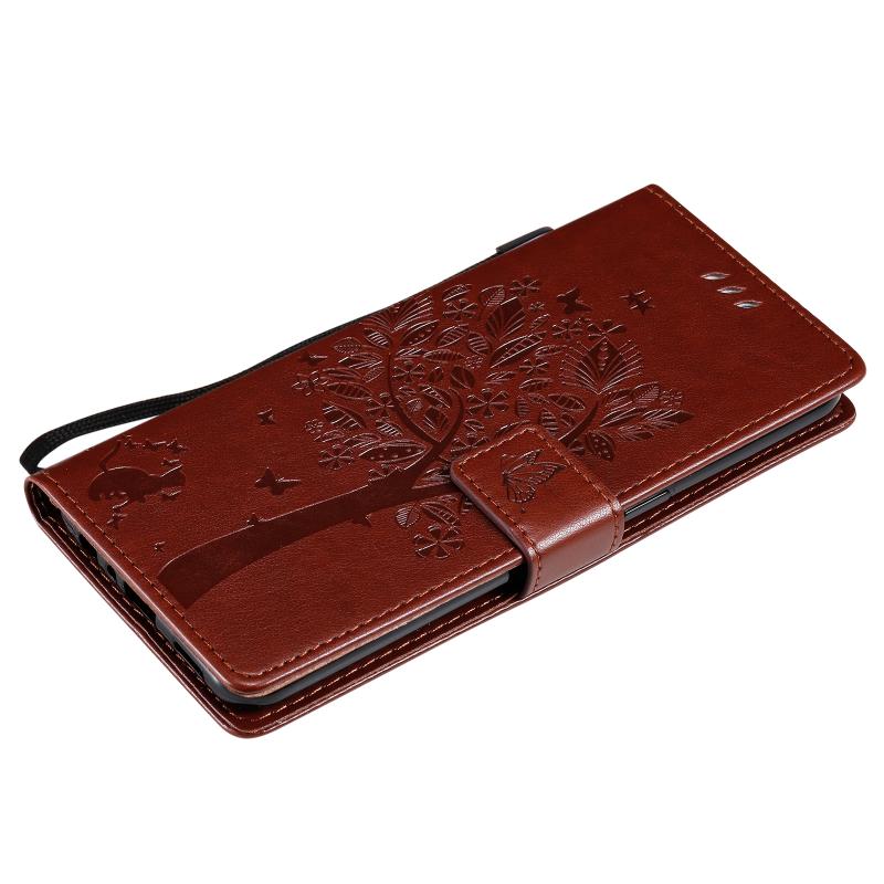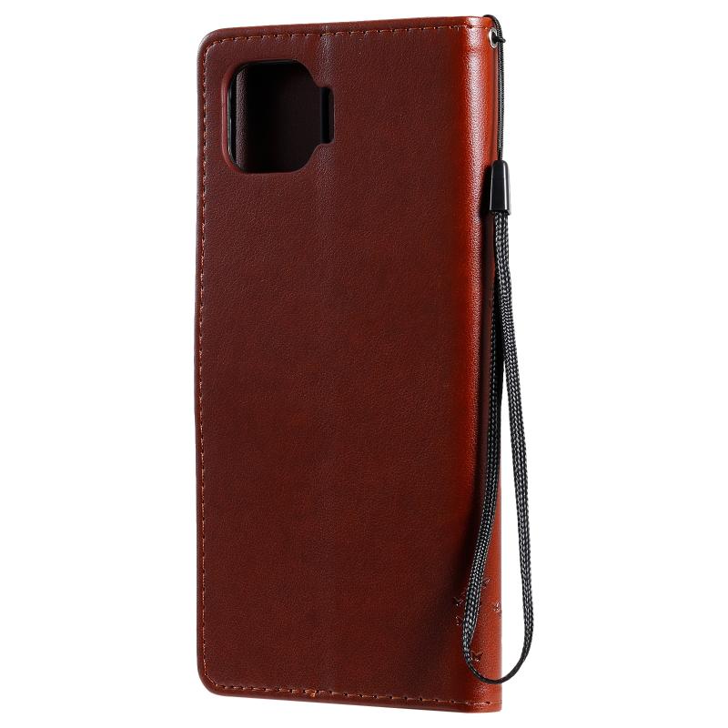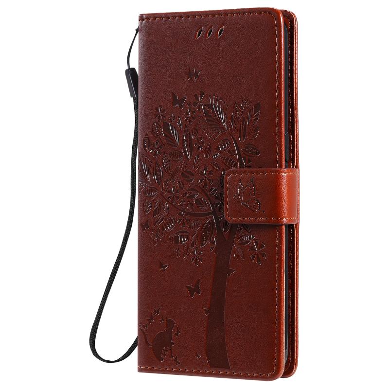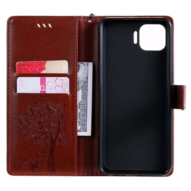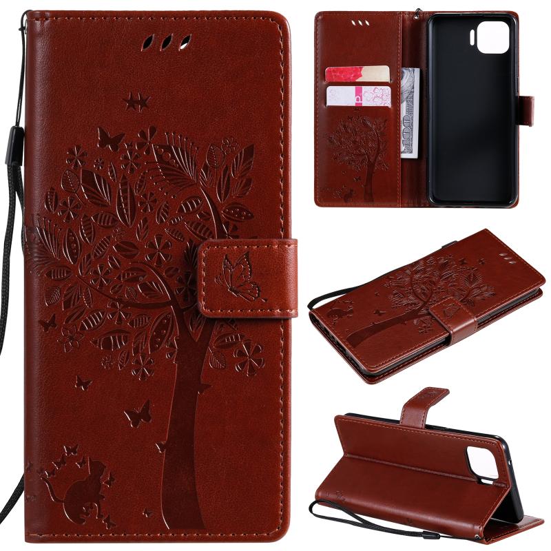 Θήκη για OPPO F17 Pro / Reno4 Lite με σχέδιο Δέντρου & Γάτας, εκτυπωμένη με θερμοτύπωση, οριζόντια αναδιπλούμενη από δερματίνη PU με βάση στήριξης & θήκες καρτών & πορτοφόλι & κορδόνι (Καφέ)