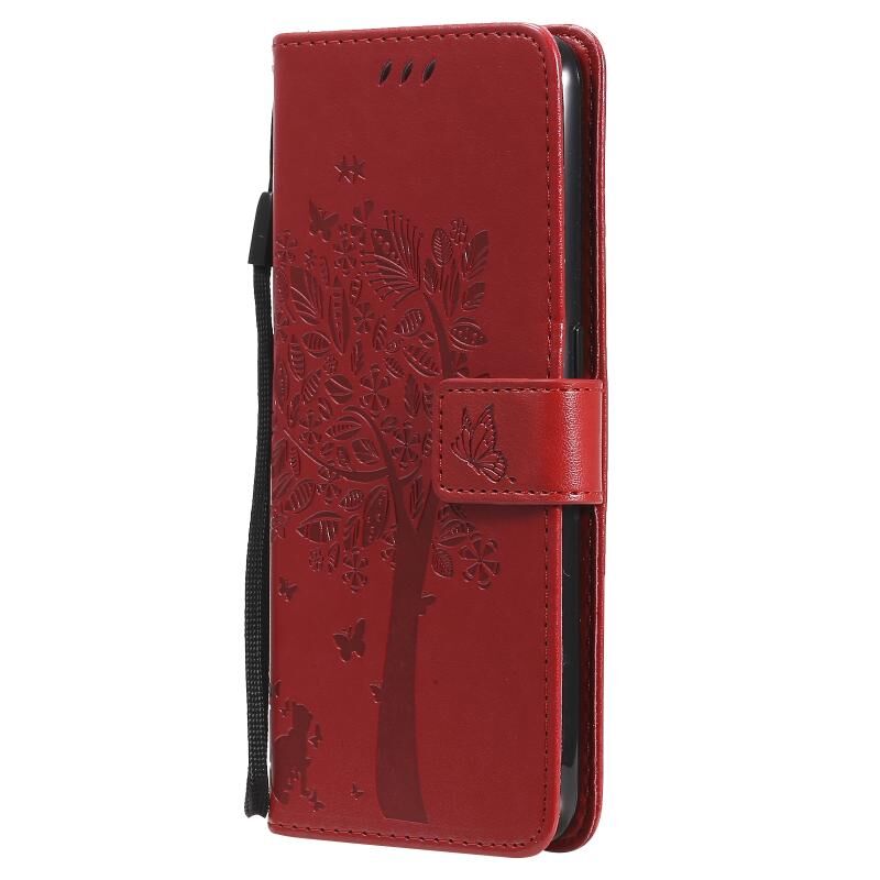 Θήκη για OPPO F19 / A74 4G με σχέδιο Δέντρου & Γάτας, εκτυπωμένη με θερμοτύπηση, οριζόντια αναδιπλούμενη από δερματίνη PU με βάση στήριξης & θήκες καρτών & πορτοφόλι & κορδόνι (Κόκκινο)