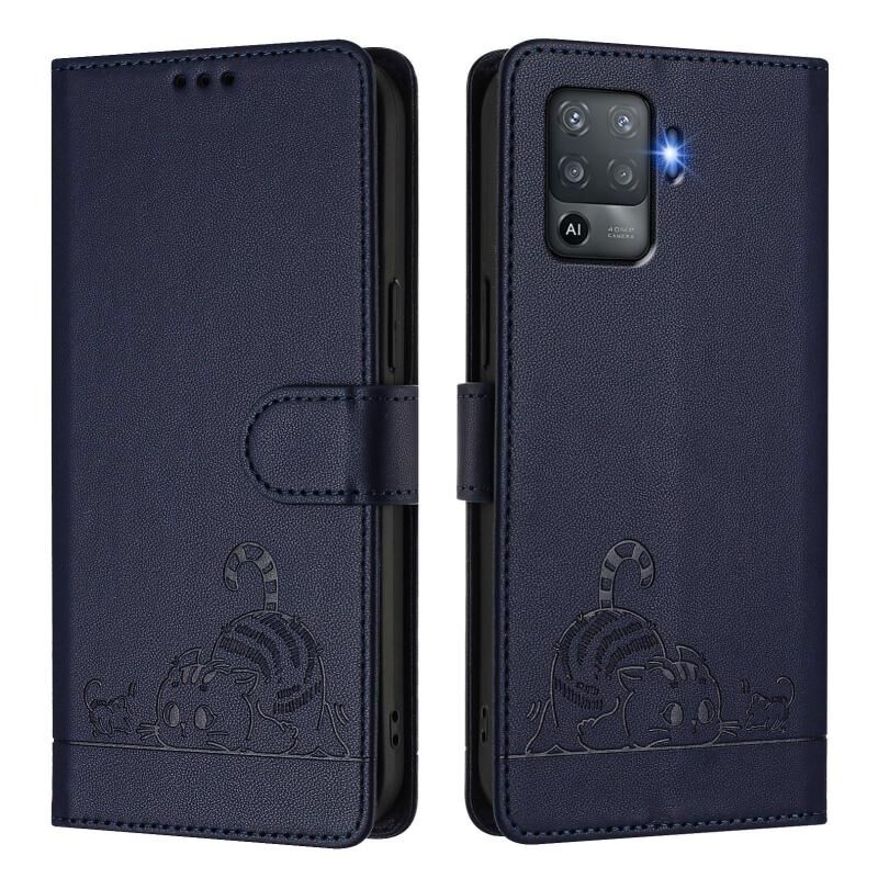 Θήκη τηλεφώνου από δέρμα με ανάγλυφο σχέδιο γάτας και ποντικού για OPPO F19 Pro / Reno5 F με κορδόνι (Μπλε)