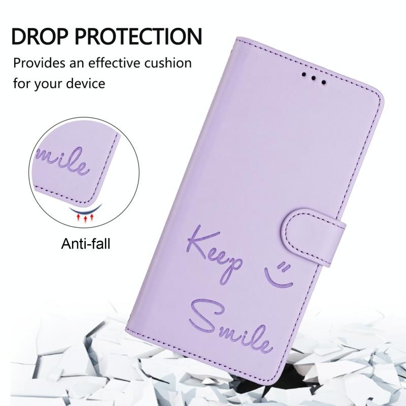 Για OPPO F19 Pro / Reno5 F Χαμόγελο ανάγλυφο RFID δερμάτινη θήκη τηλεφώνου (ανοιχτό μωβ)