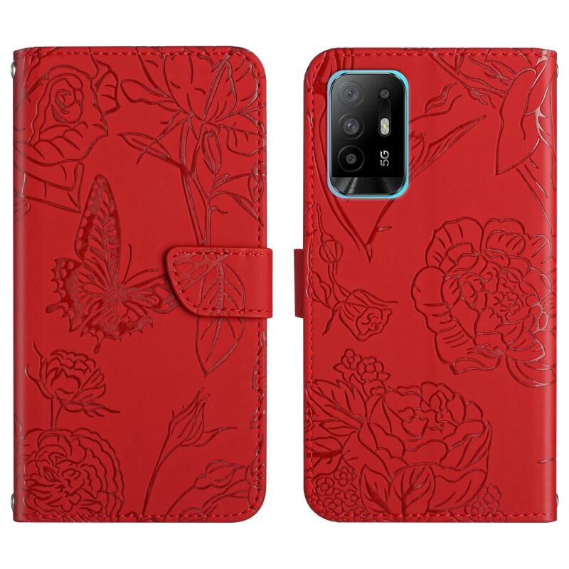 Θήκη τηλεφώνου από δέρμα με ανάγλυφο σχέδιο πεταλούδας και παιώνιας για OPPO F19 Pro+ (Κόκκινο)