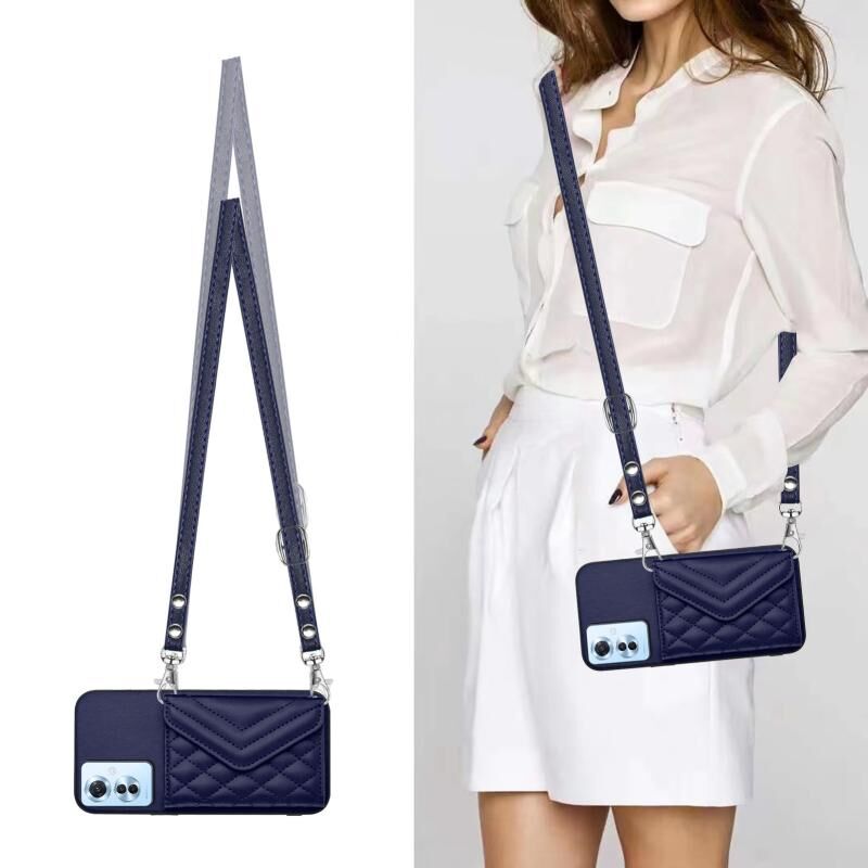 Για OPPO F25 Pro 5G Ινδία Rhombic υφή κάρτα τσάντα RFID υπόθεση τηλεφώνου με μακρύ κορδόνι (Μπλε)