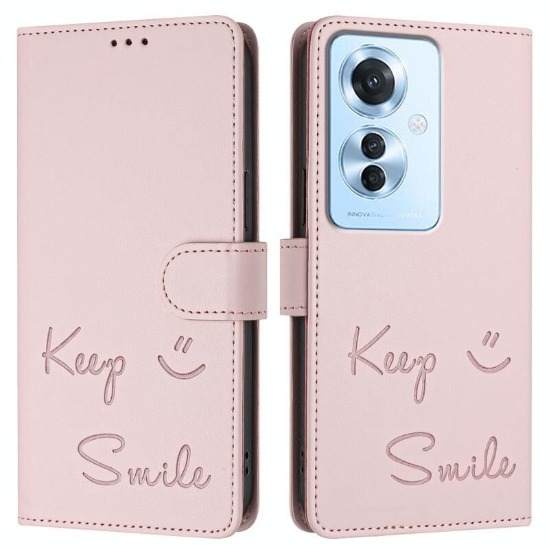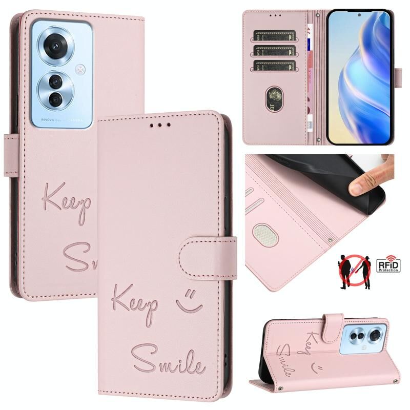 Για OPPO F25 Pro 5G Ινδία χαμόγελο ανάγλυφο RFID δερμάτινη θήκη τηλεφώνου (ρόζ)