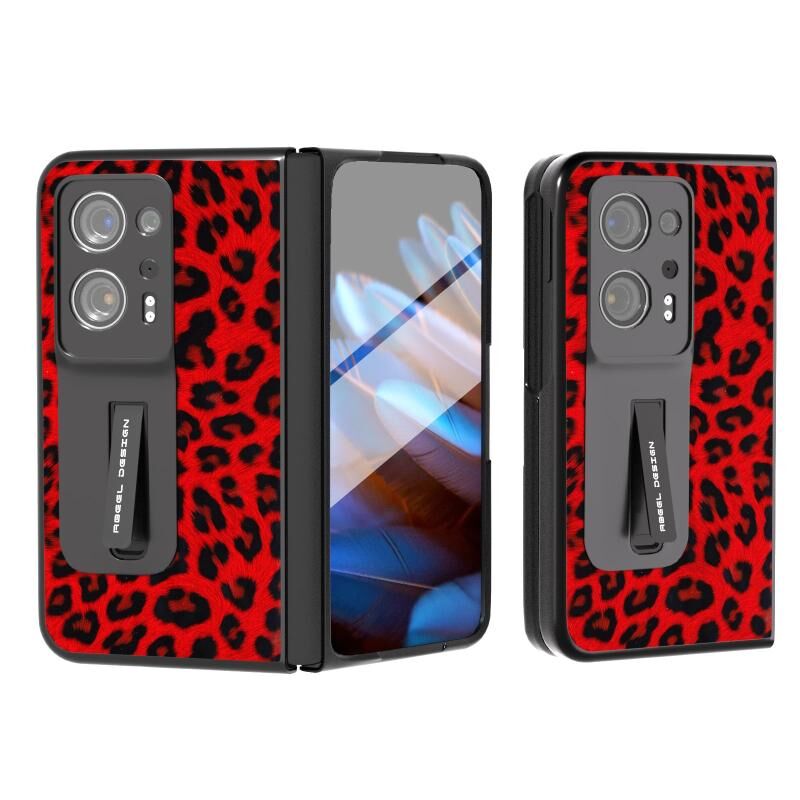 Θήκη τηλεφώνου για OPPO Find N2 ABEEL Ενοποιημένη Μαύρη Άκρη Λεοπάρδαλη με Στήριξη (Κόκκινο)