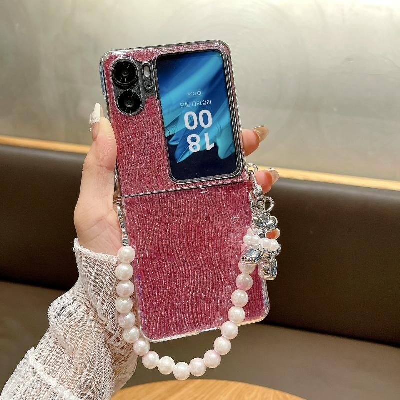Για OPPO Βρείτε N2 Flip PC Side Πόρπη + κυματισμούς Glitter χαρτί πλήρους κάλυψης τηλέφωνο υπόθεση με βραχιόλι (Κόκκινο)