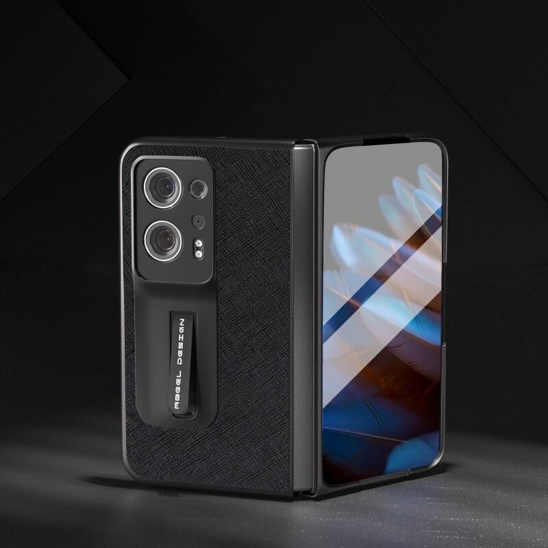 Θήκη τηλεφώνου από γνήσιο δέρμα με ενσωματωμένη διασταυρούμενη υφή για OPPO Find N2 με βάση (Μαύρο)