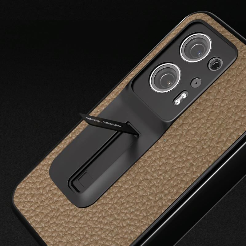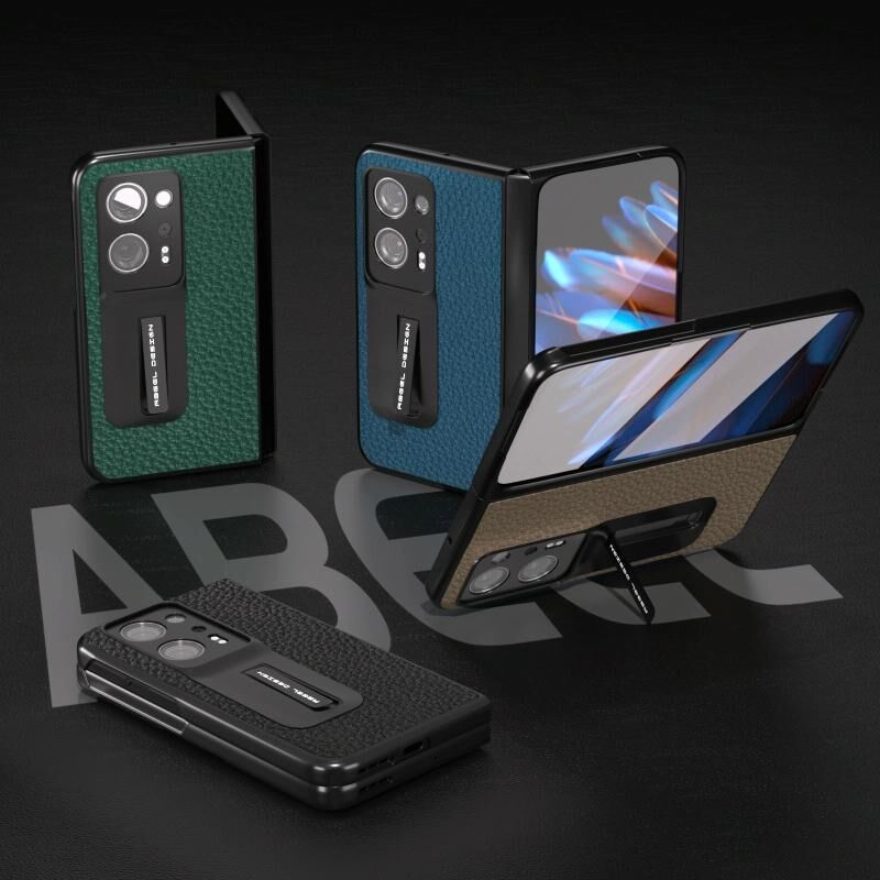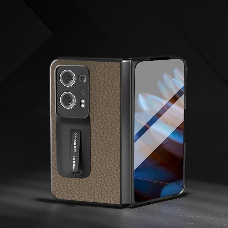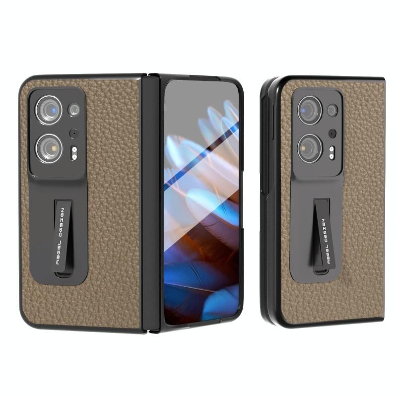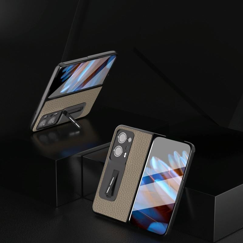 Θήκη τηλεφώνου από γνήσιο δέρμα Lychee για OPPO Find N2 με βάση στήριξης (Γκρι)