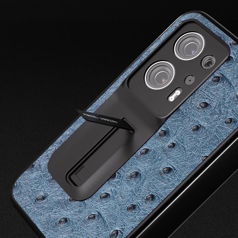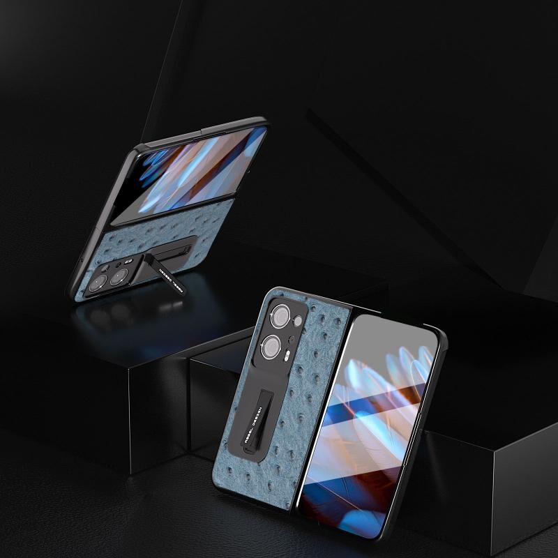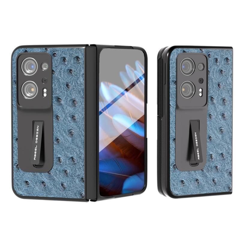 Θήκη τηλεφώνου από γνήσιο δέρμα στρουθοκάμπου με υφή για OPPO Find N2 με βάση στήριξης (Μπλε)