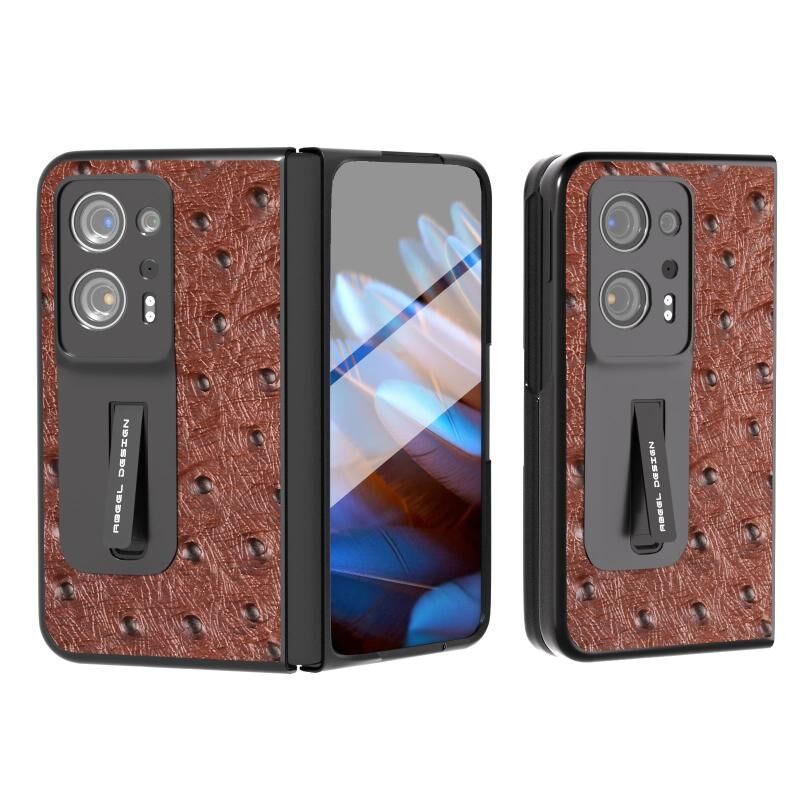 Θήκη τηλεφώνου από γνήσιο δέρμα στρουθοκάμπου με υφή για OPPO Find N2 με βάση στήριξης (Καφέ)
