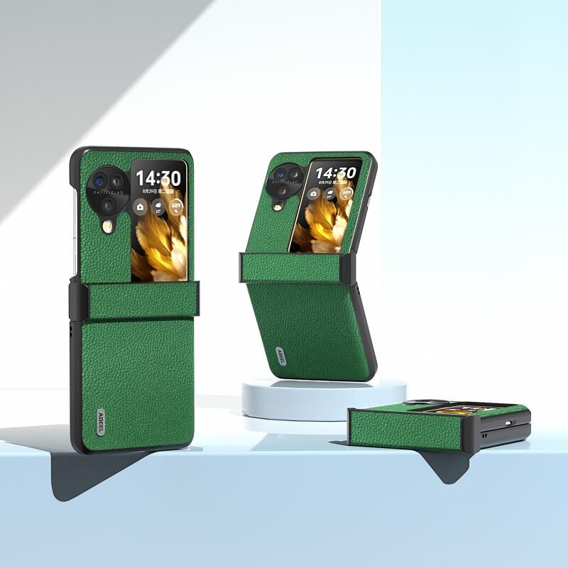 Θήκη τηλεφώνου Mino από γνήσιο δέρμα για OPPO Find N3 Flip ABEEL, με μαύρο περίγραμμα και αρθρωτό μηχανισμό (Green)