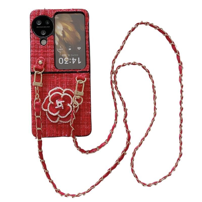 Για OPPO Βρείτε N3 Flip Camellia καρό ύφασμα PC τηλέφωνο υπόθεση με μακρύ κορδόνι (Κόκκινο)