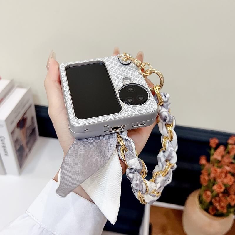 Θήκη τηλεφώνου OPPO Find N3 Flip Sparkling Diamond Rhombus από πολυανθρακικό υλικό με βραχιόλι μεταξωτού μαντηλιού (Μωβ)