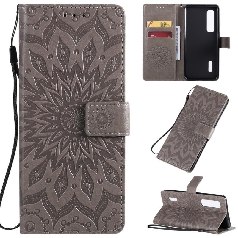 Θήκη για OPPO Find X2 Pro με εκτύπωση Pressed Printing, σχέδιο ηλίανθου, οριζόντια αναδίπλωση, από δερματίνη PU με βάση στήριξης, θήκες για κάρτες, πορτοφόλι & λουρί (Γκρι)