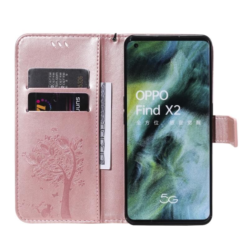 Θήκη για OPPO Find X2 με σχέδιο Δέντρου & Γάτας, με εκτύπωση σε PU δέρμα, οριζόντια αναδίπλωση, με βάση στήριξης, θήκες για κάρτες, πορτοφόλι & λουρί (Ροζ χρυσός)