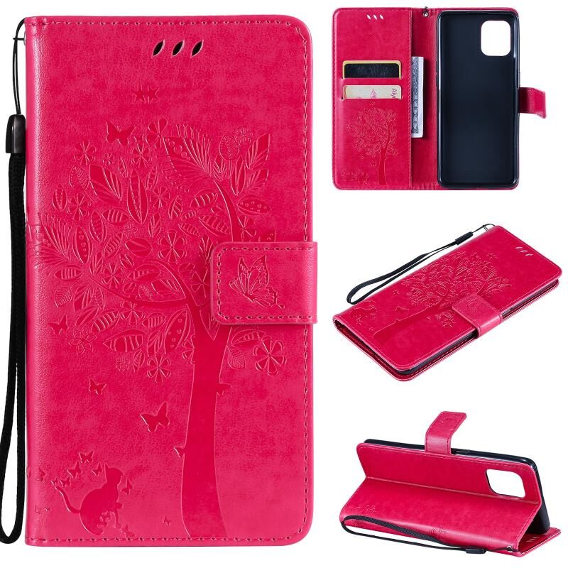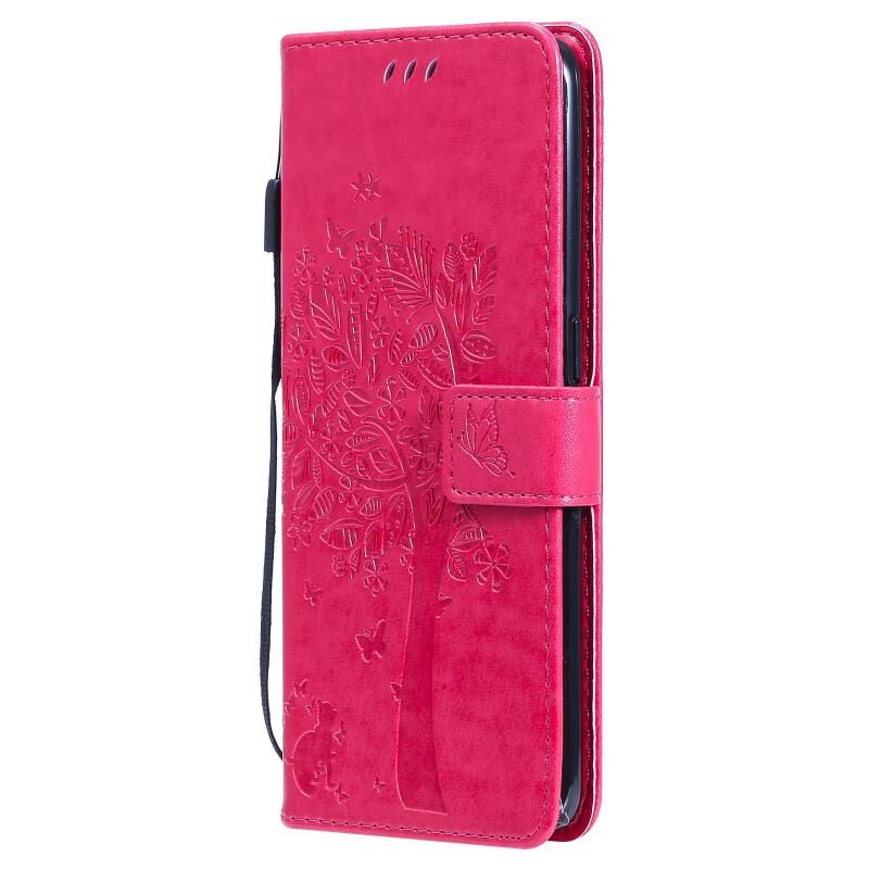 Θήκη για OPPO Find X3 / X3 Pro με σχέδιο Δέντρου & Γάτας, εκτυπωμένη με θερμοτύπωση, οριζόντια, από δερματίνη PU με βάση στήριξης & θήκες για κάρτες & πορτοφόλι & κορδόνι (Ροζέ κόκκινο)