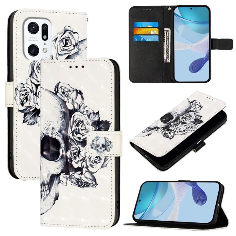 Θήκη τηλεφώνου από δέρμα με οριζόντια αναδίπλωση και τρισδιάστατη ζωγραφική για OPPO Find X5 (Κρανίο)