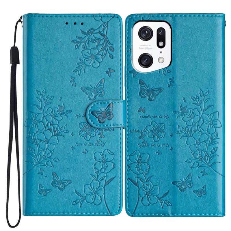 Θήκη τηλεφώνου από δέρμα για OPPO Find X5 Pro - Πεταλούδες και Λουλούδια (Μπλε)