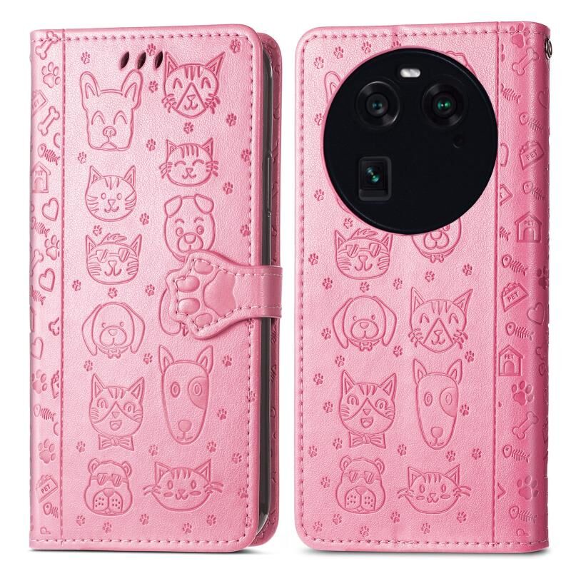 Θήκη τηλεφώνου από δέρμα με ανάγλυφο σχέδιο γάτας και σκύλου για OPPO Find X6 (Μωβ)