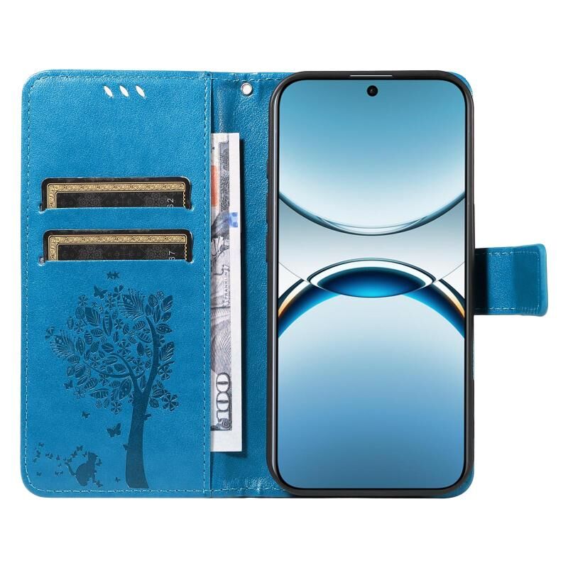 Θήκη τηλεφώνου από δέρμα με σχέδιο αναγλύφου δέντρου & γάτας για OPPO Find X8 (Μπλε)