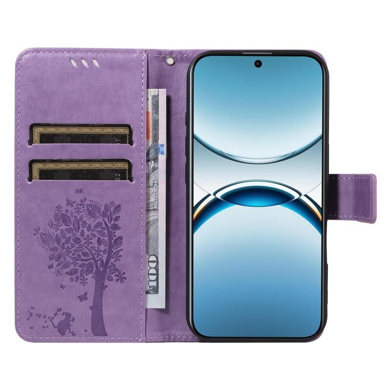 For OPPO Find X8 Global Tree & Cat Embossed Pattern Flip Leather Phone Case(Light Purple)