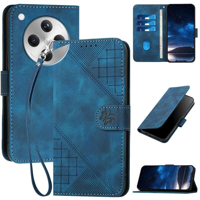 For OPPO Find X8 Grid Butterfly Embossed Pattern Leather Phone Case with Lanyard(Dark Blue)