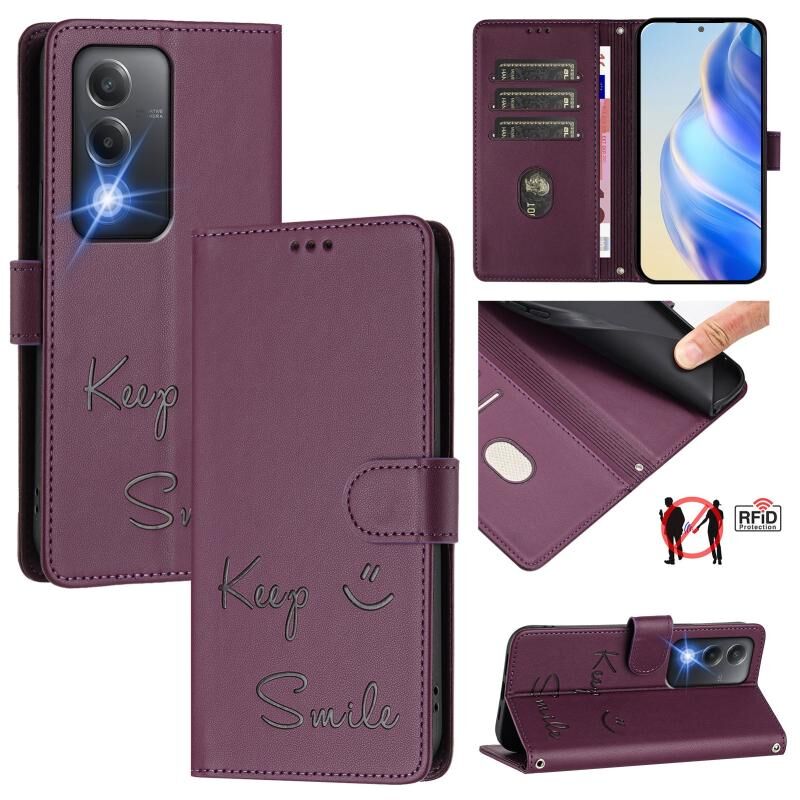 Για OPPO K12x 5G Παγκόσμια χαμόγελο ανάγλυφο RFID δερμάτινη θήκη τηλεφώνου (Violet)