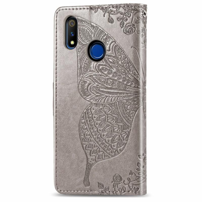 Θήκη δέρματος οριζόντιας αναδίπλωσης για OPPO Realme 3 Pro με ανάγλυφο σχέδιο πεταλούδας, λουλουδιών, βάση στήριξης / υποδοχή κάρτας / πορτοφόλι / κορδόνι (Γκρι)
