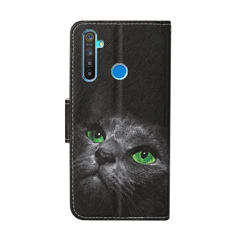 Θήκη δέρματος οριζόντιας αναδίπλωσης με σχέδια πολύχρωμης ζωγραφικής για OPPO Realme 5 με βάση & υποδοχές καρτών & πορτοφόλι (Σχέδιο Γάτας)