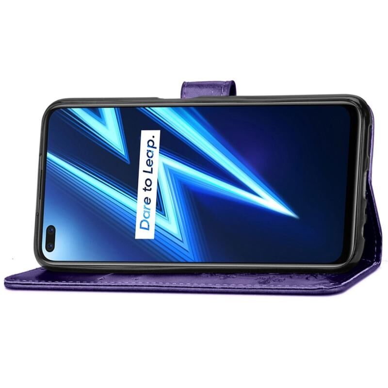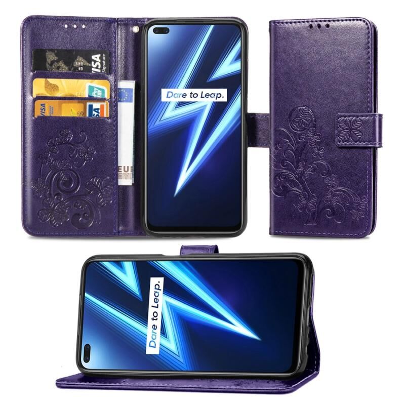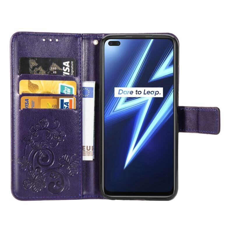 Για Oppo Realme 6 Pro Θήκη Δέρματος με Πατήματα Λουλουδιών Clover, με Στήριξη & Θήκες Καρτών & Πορτοφόλι & Λουρί Χεριού (Μωβ)