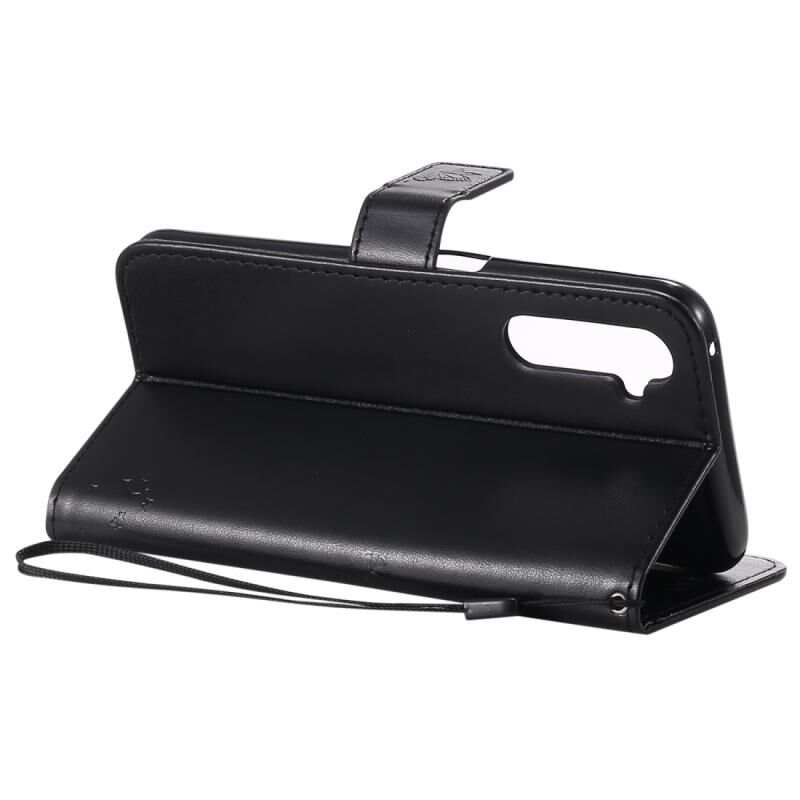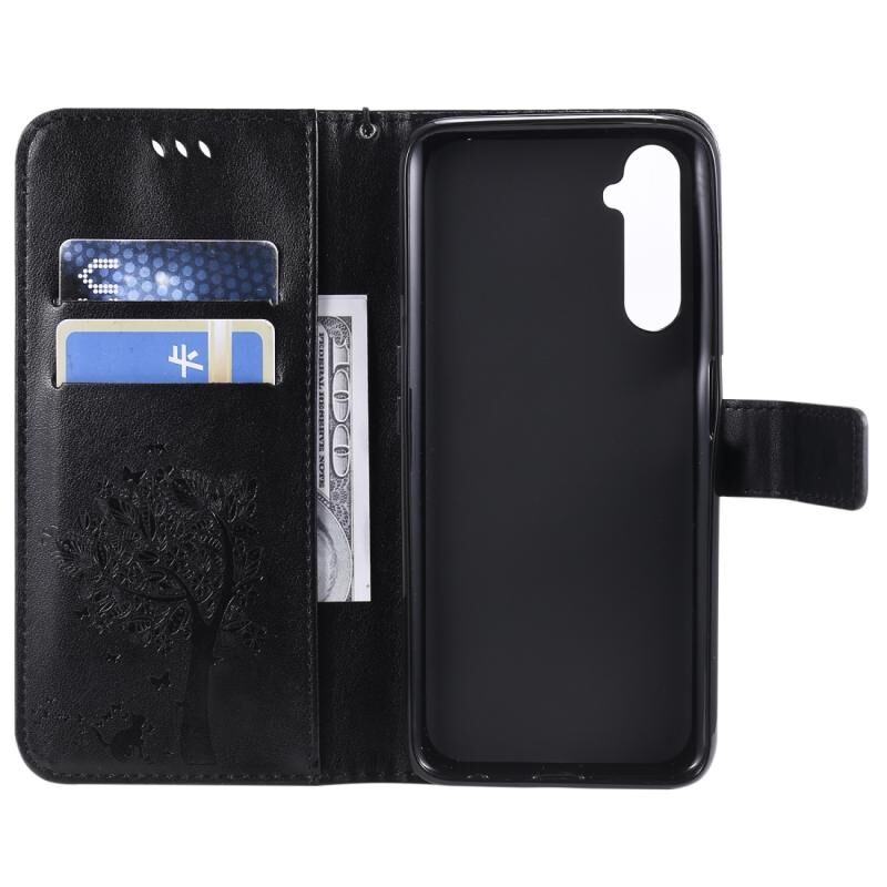 Θήκη για OPPO Realme 6 Pro με σχέδιο Δέντρου & Γάτας, εκτυπωμένη με θερμοτύπωση, οριζόντια αναδιπλούμενη από δερματίνη PU με βάση στήριξης & θήκες καρτών & πορτοφόλι & κορδόνι (Πράσινο)