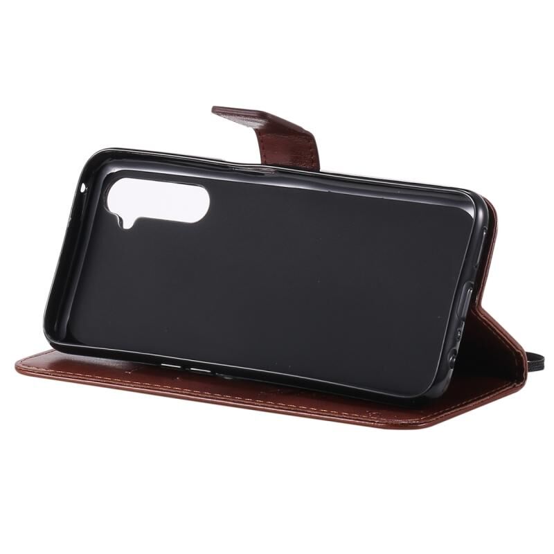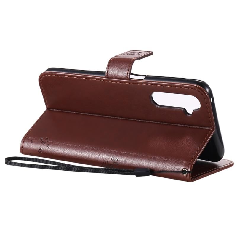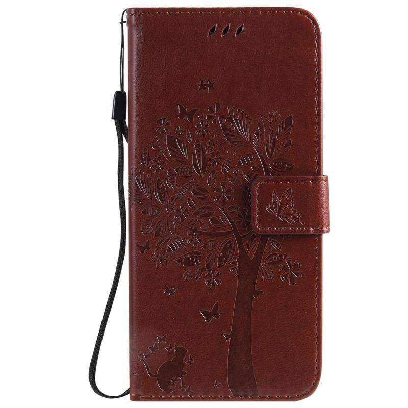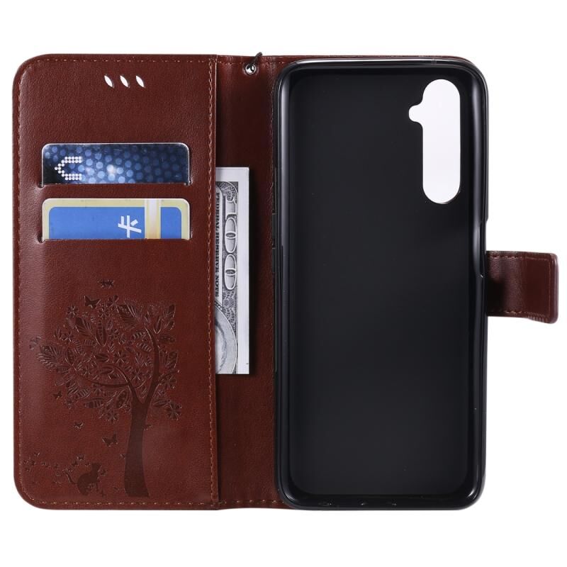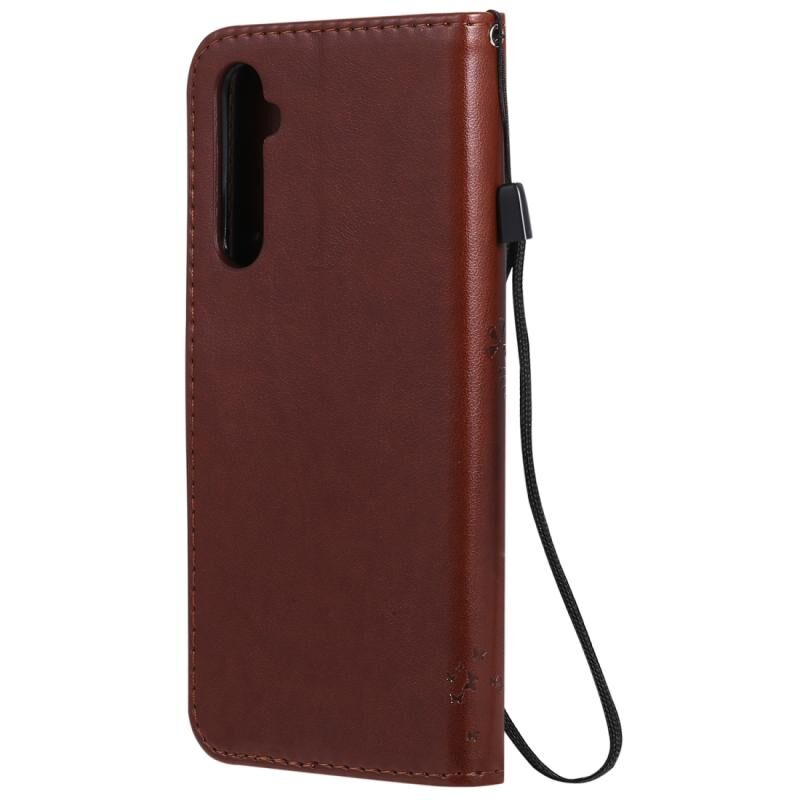 Θήκη για OPPO Realme 6 Pro με σχέδιο Δέντρου & Γάτας, εκτυπωμένη με θερμοτύπωση, οριζόντια αναδιπλούμενη από δερματίνη PU με βάση στήριξης & θήκες καρτών & πορτοφόλι & κορδόνι (Μωβ)