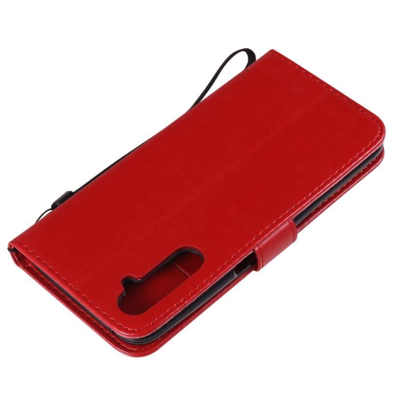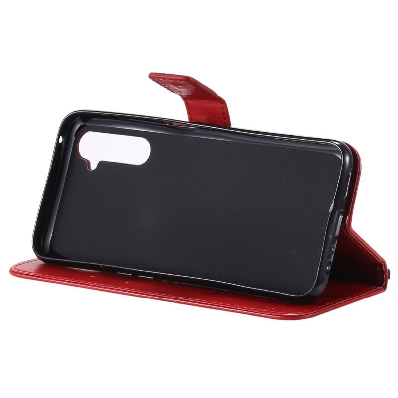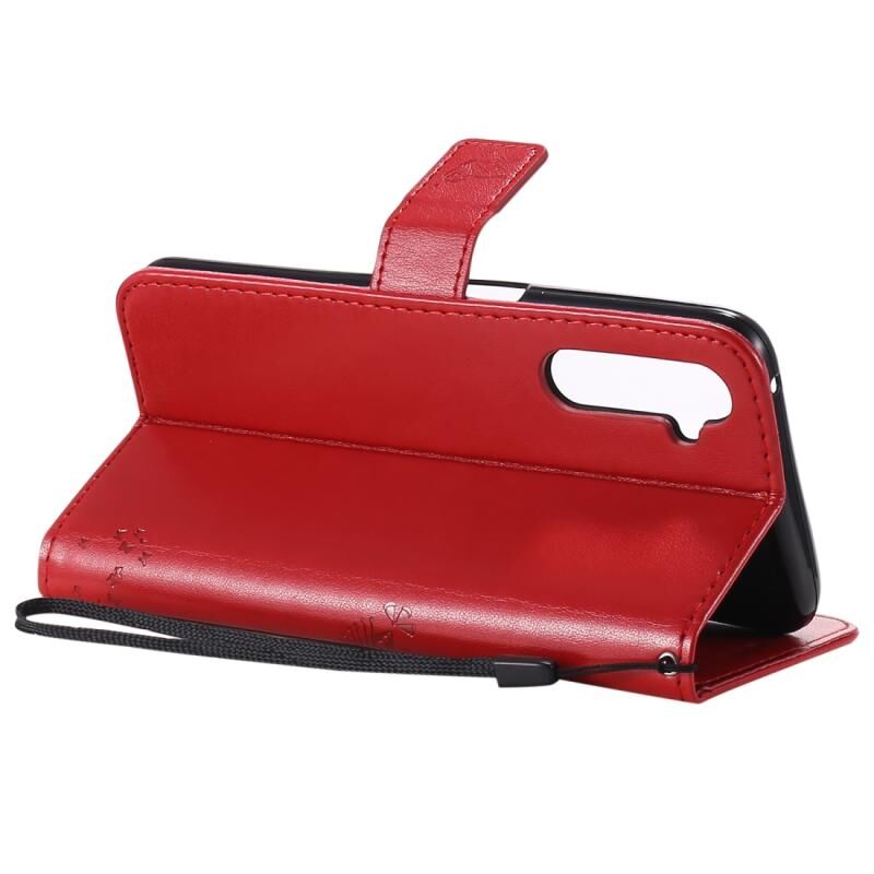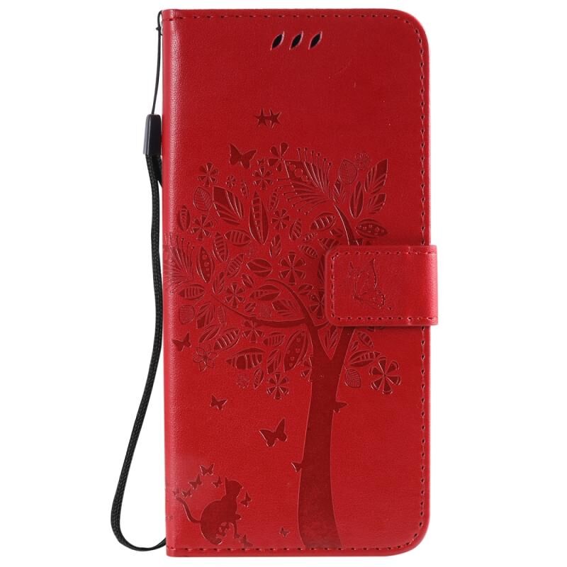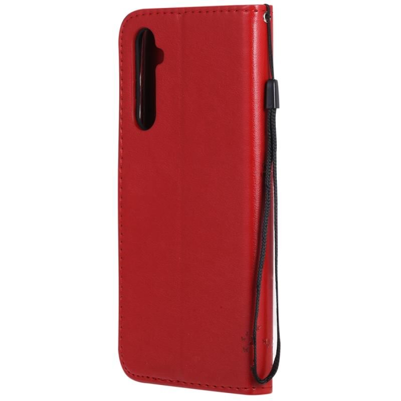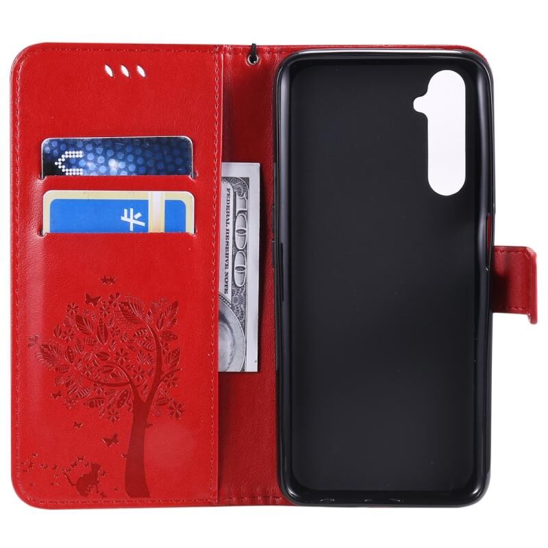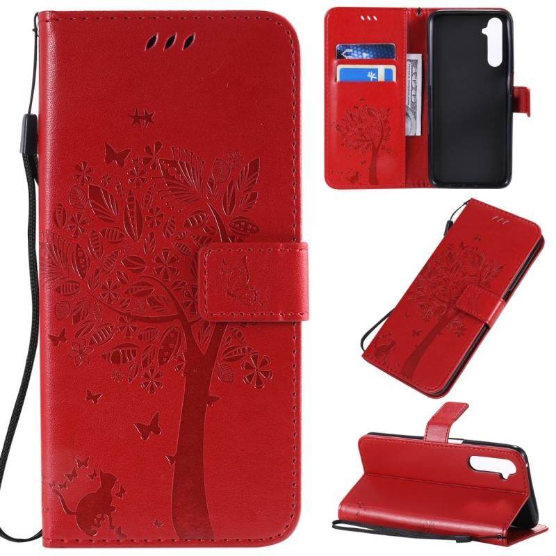 Θήκη για OPPO Realme 6 Pro με σχέδιο Δέντρου & Γάτας, εκτυπωμένη με θερμοτύπωση, οριζόντια αναδιπλούμενη από δερματίνη PU με βάση στήριξης & θήκες καρτών & πορτοφόλι & κορδόνι (Μωβ)